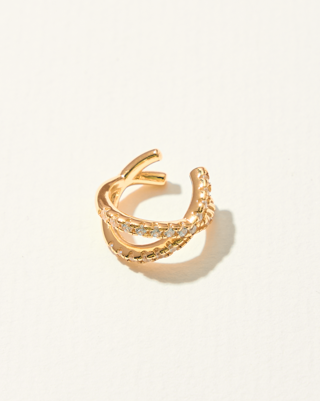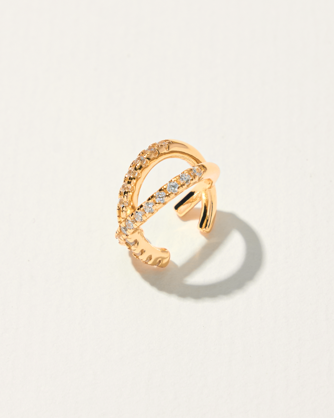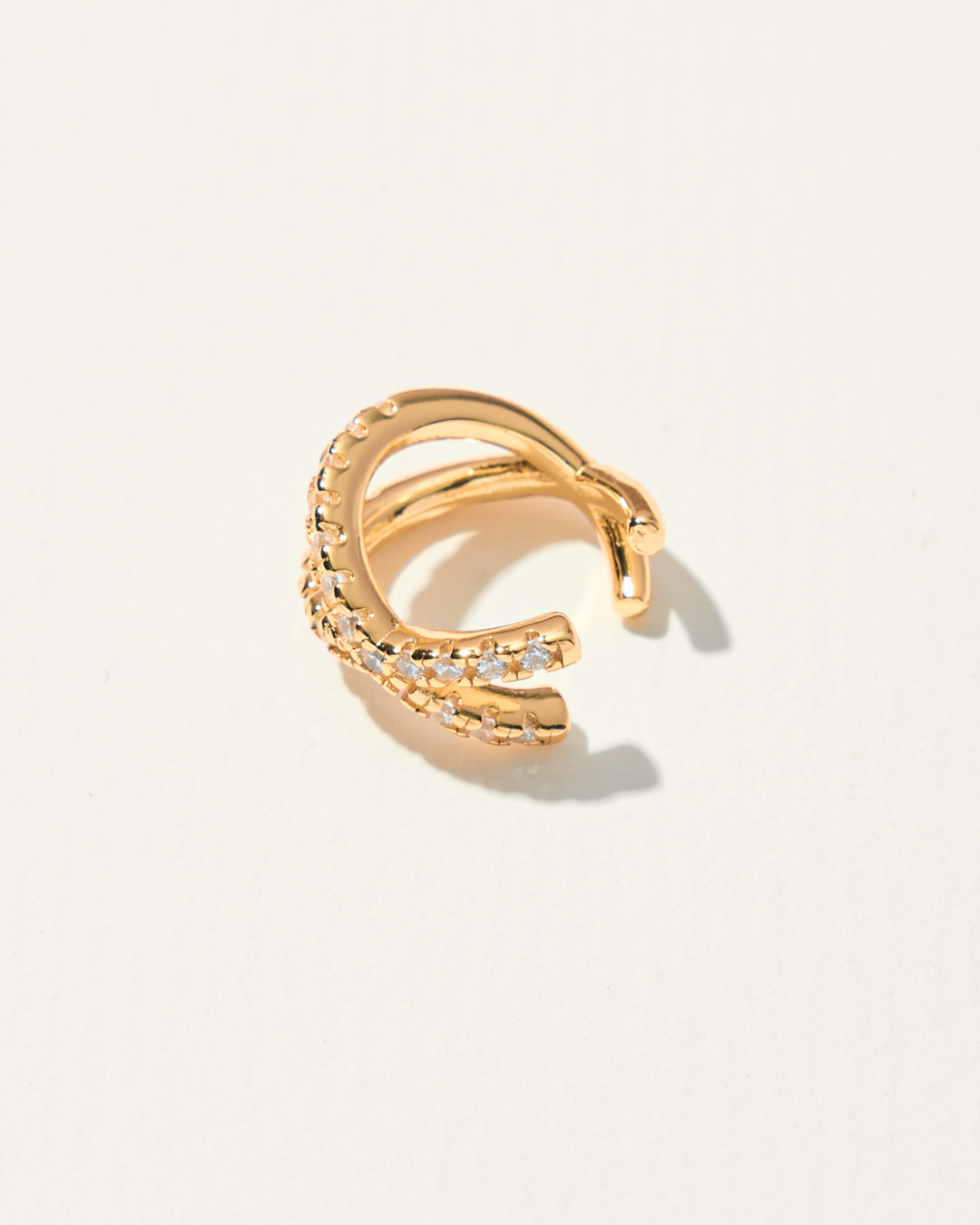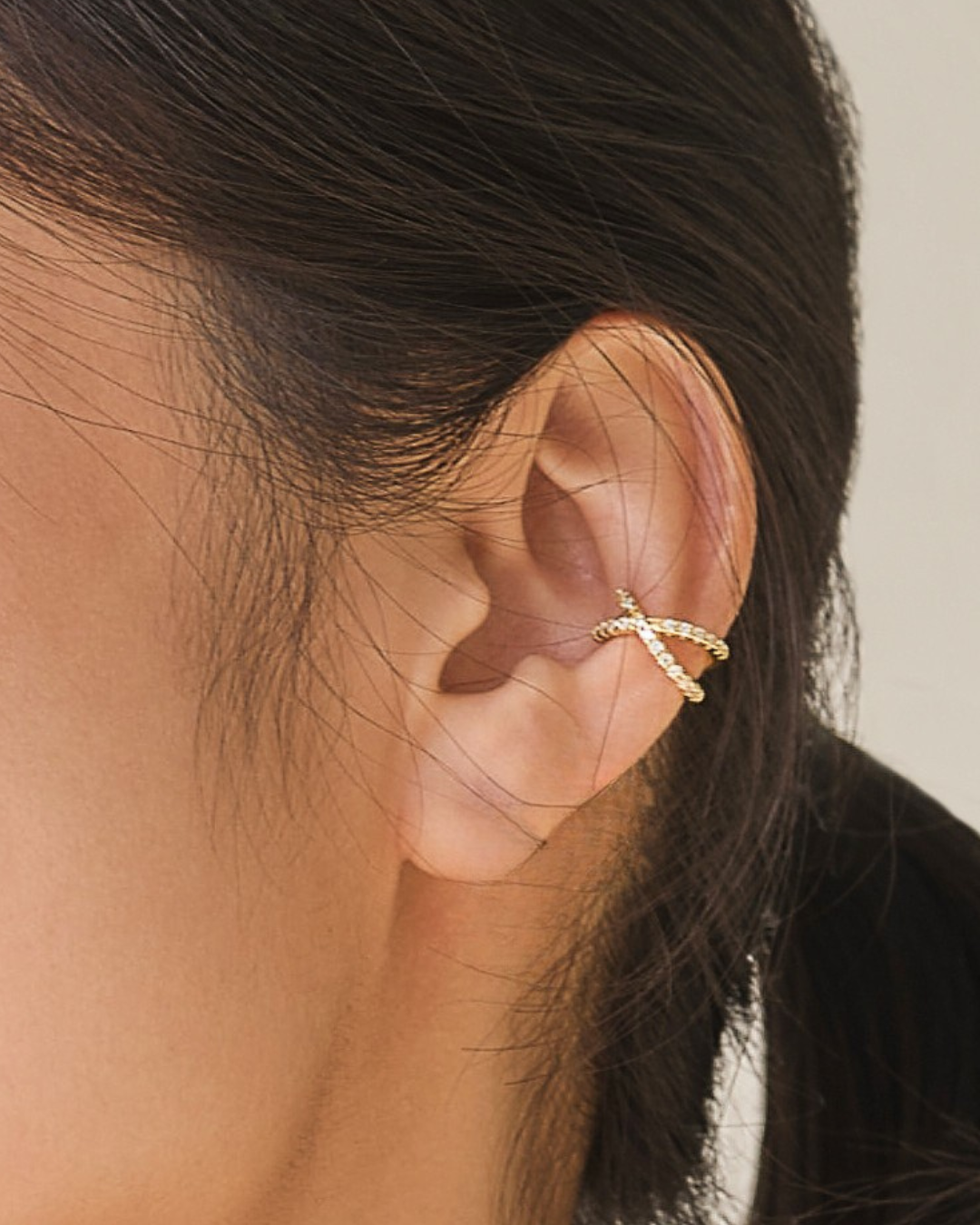 - Design: A bold ear cuff (no piercing needed) with a surface fully paved with sparkling stones.