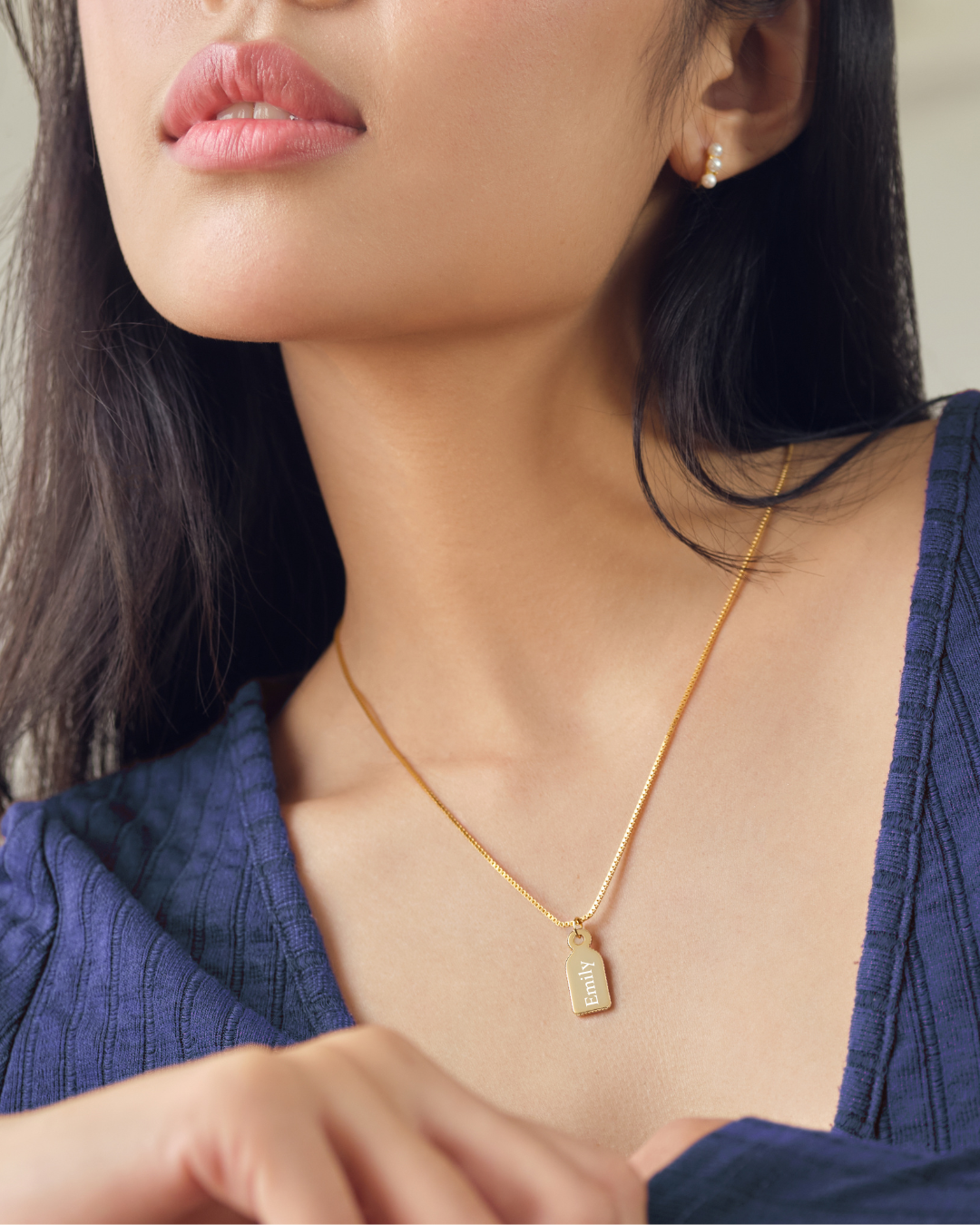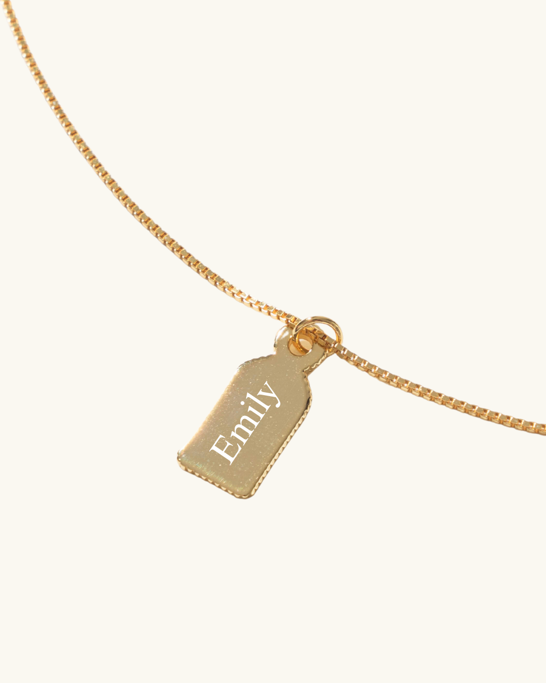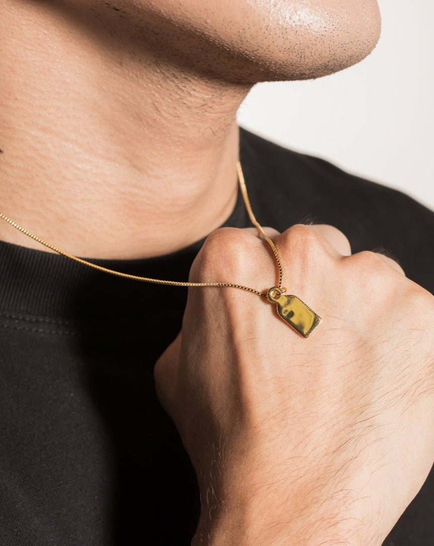 - Design: A box chain necklace with a unique, dome-topped tag pendant designed for custom engraving.
