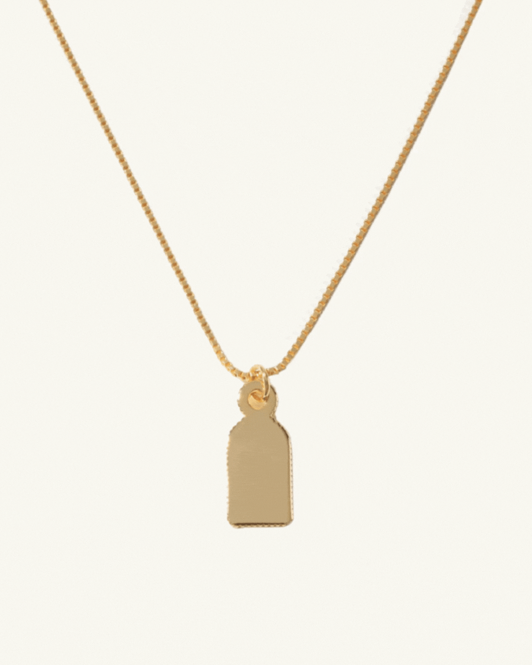 A modern heirloom designed to tell your story. This necklace features a unique tag pendant with a gracefully domed top, offering a spacious, polished canvas for your most personal engravings. Suspended from a delicate-yet-strong box chain, it's a deeply meaningful piece of wearable art.