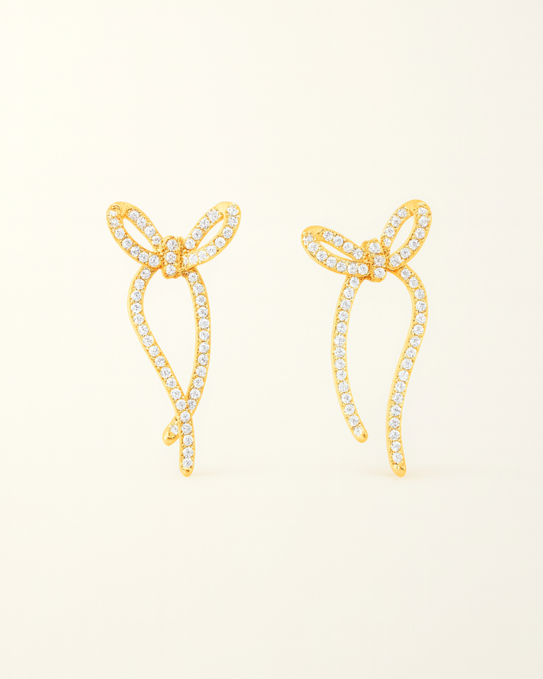 - Design: A drop earring featuring a sparkling CZ stud and a dangling, sculptural golden bow.