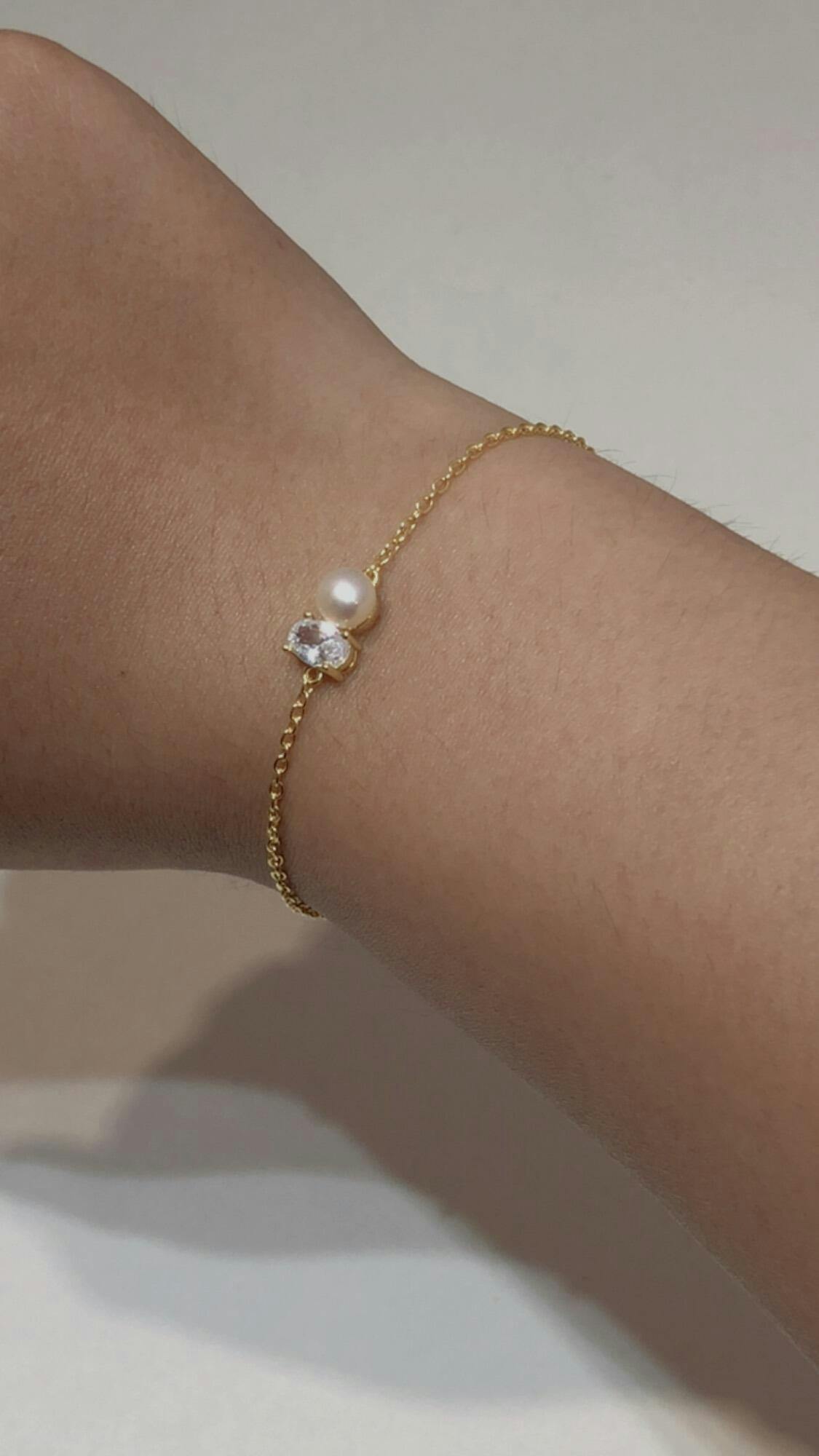 Find beauty in balance with the Pearl & Diamond bracelet. This delicate design features natural pearls combined with a sparkling gemstone mounted on the bezel, symbolizing a perfect connection. It is a subtle yet meaningful statement, celebrating the elegant beauty of connection.