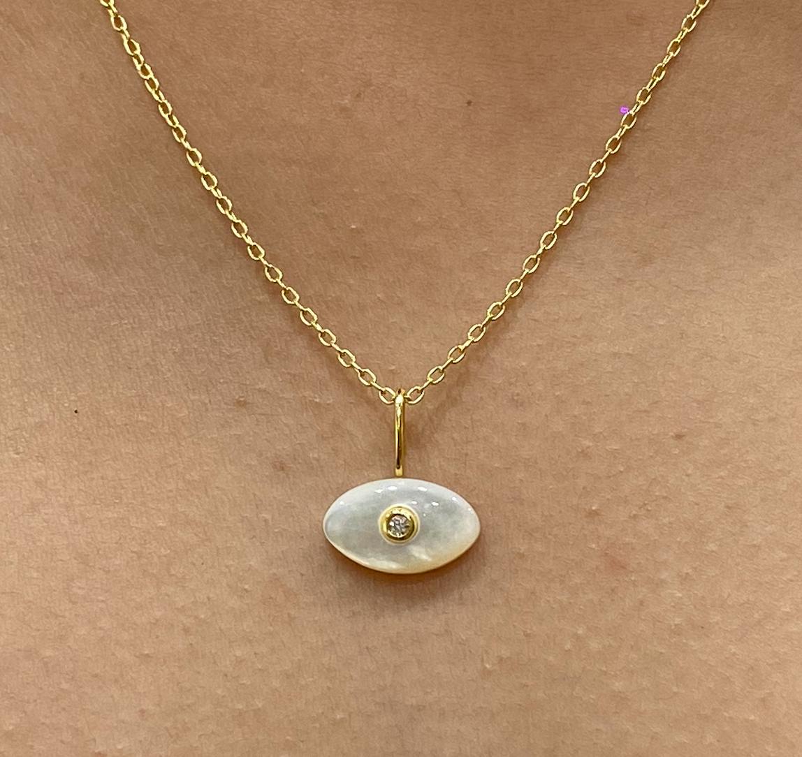 A symbol of protection, reimagined with modern elegance. Our Evil Eye charm is crafted from luminous mother of pearl to watch over you with a gentle, pearlescent gaze. Add this meaningful talisman to your favorite chain to carry good energy with you, wherever you go.