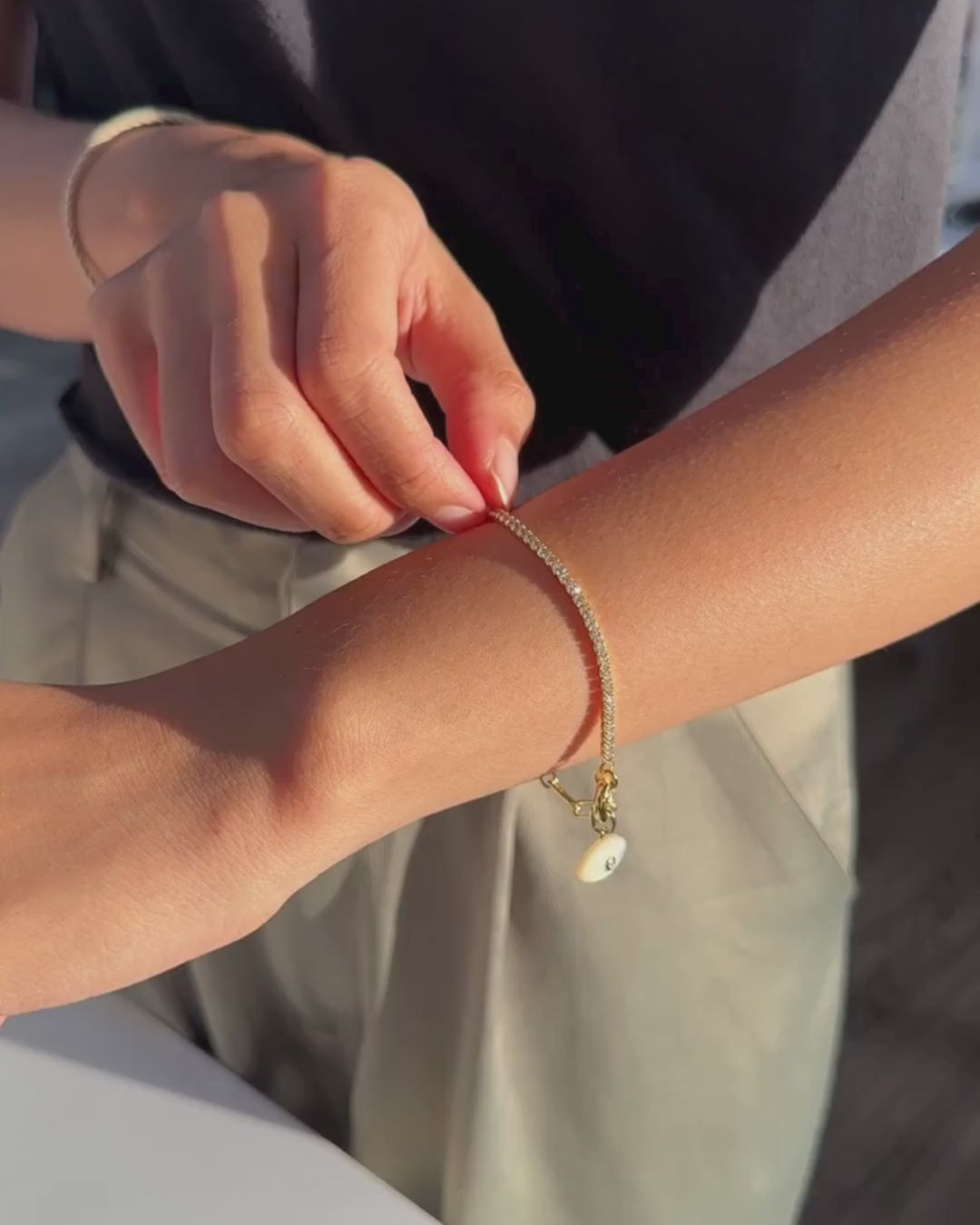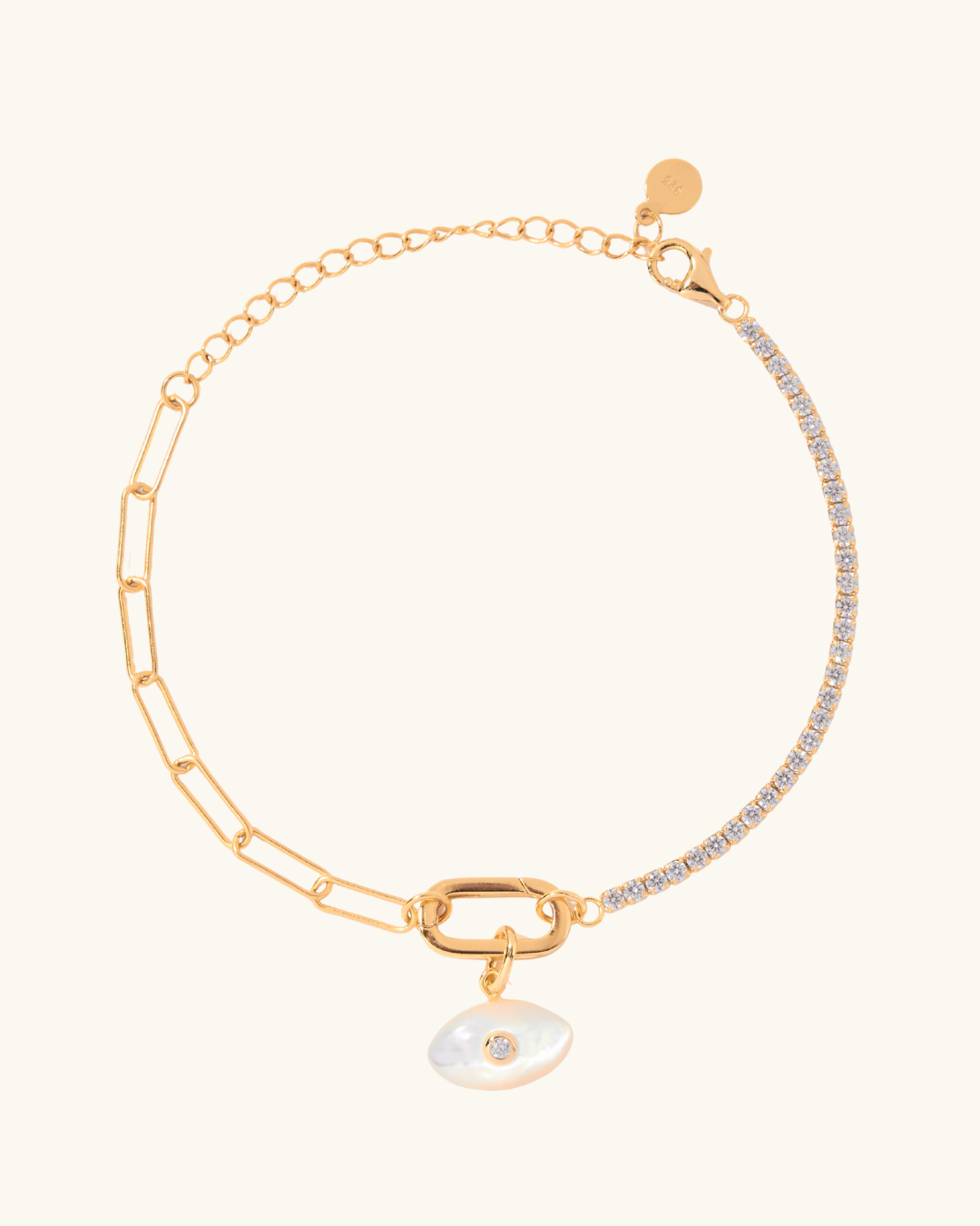- Material: 16K Gold Vermeil, mother of Pearl charm with a crystal accent.