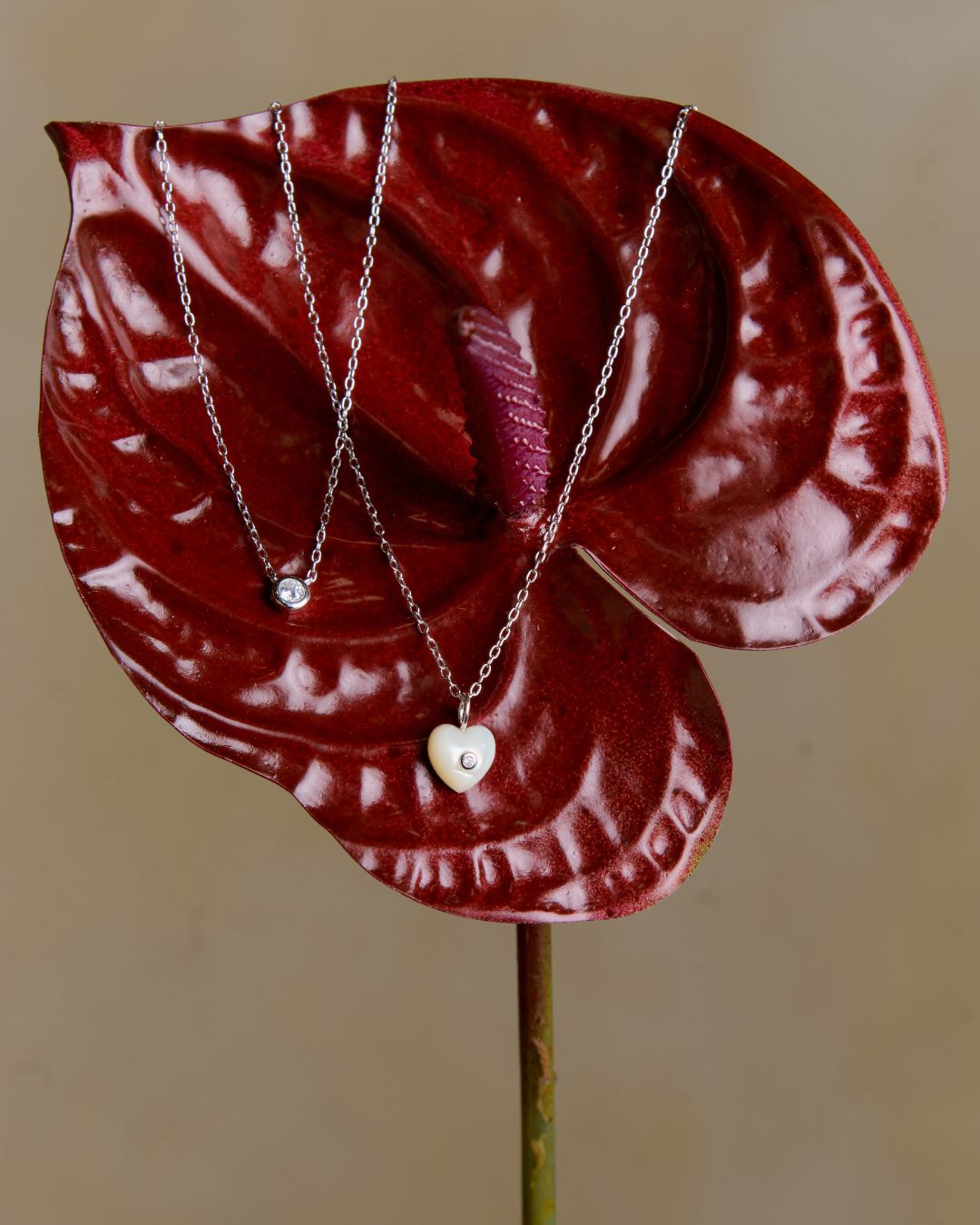 - Design: A classic heart-shaped charm carved from luminous mother of pearl.