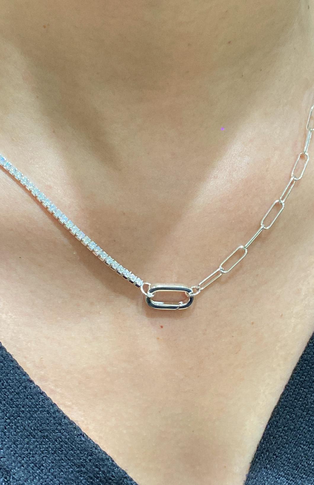 - Design: A "half-and-half" necklace, with one side a classic chain and the other a strand of channel-set stones, joined by a central clasp.