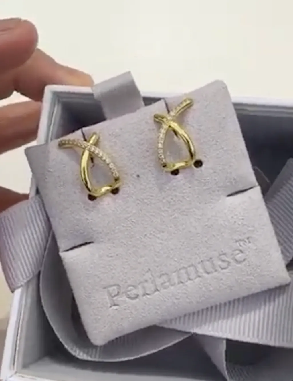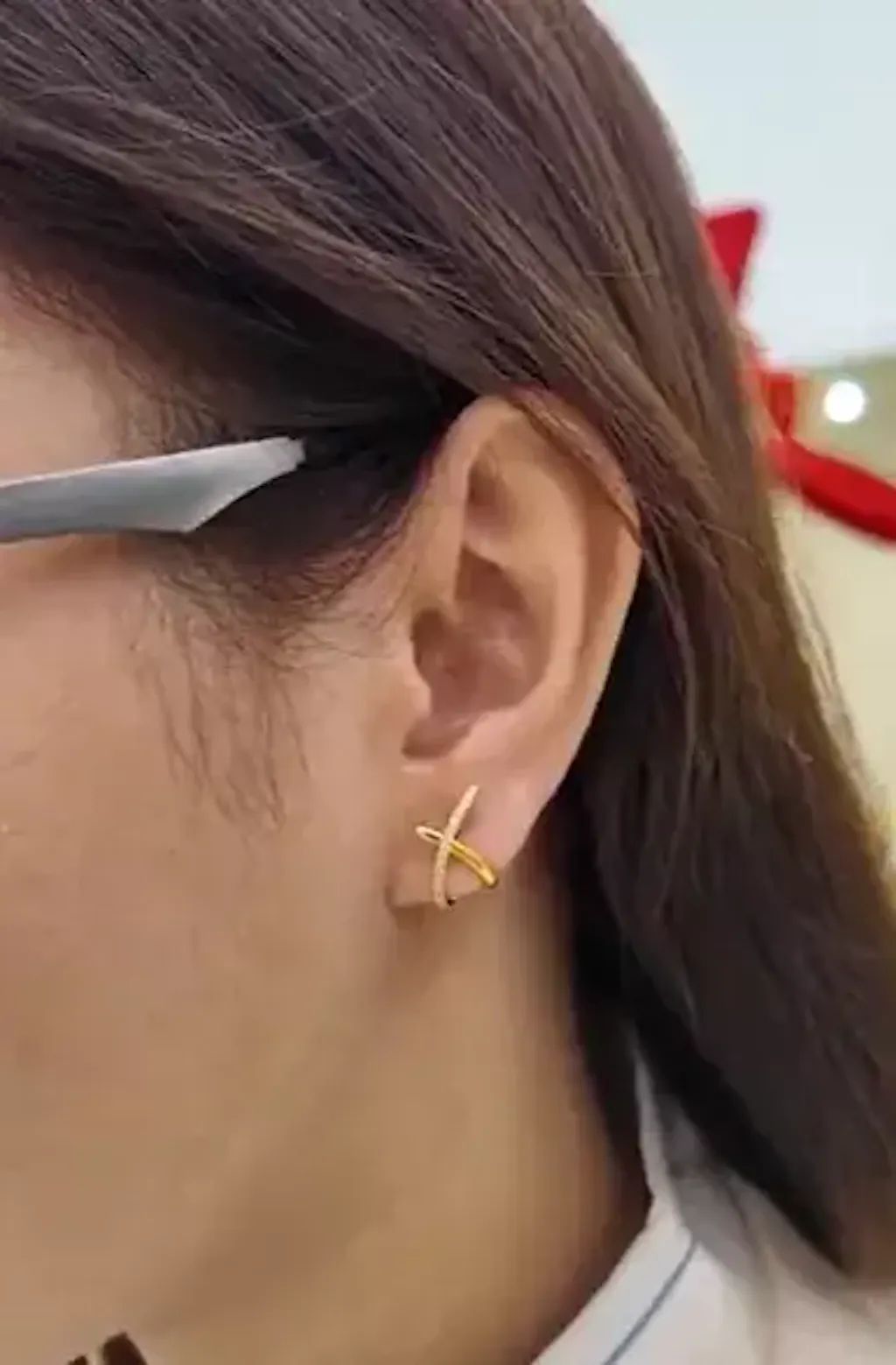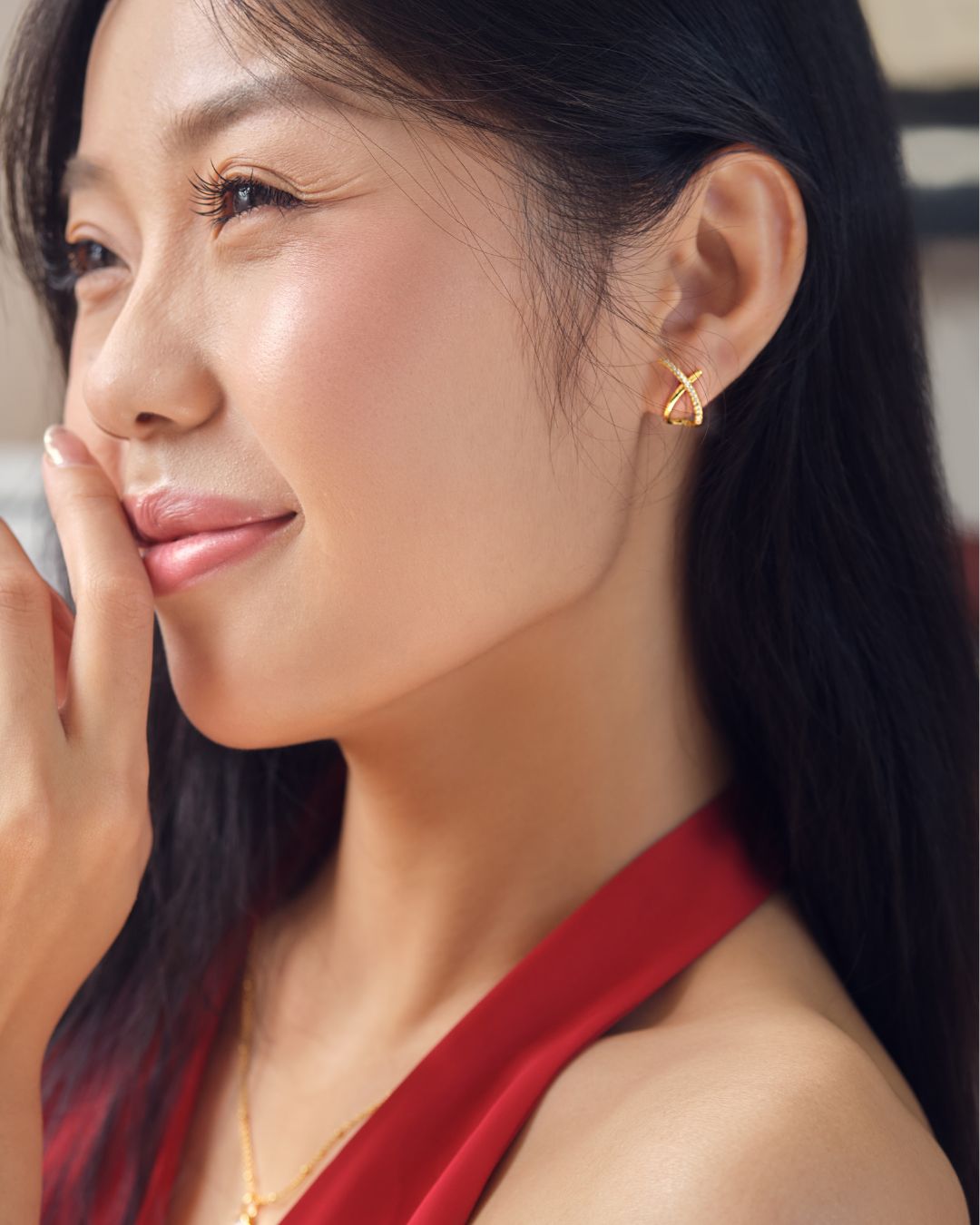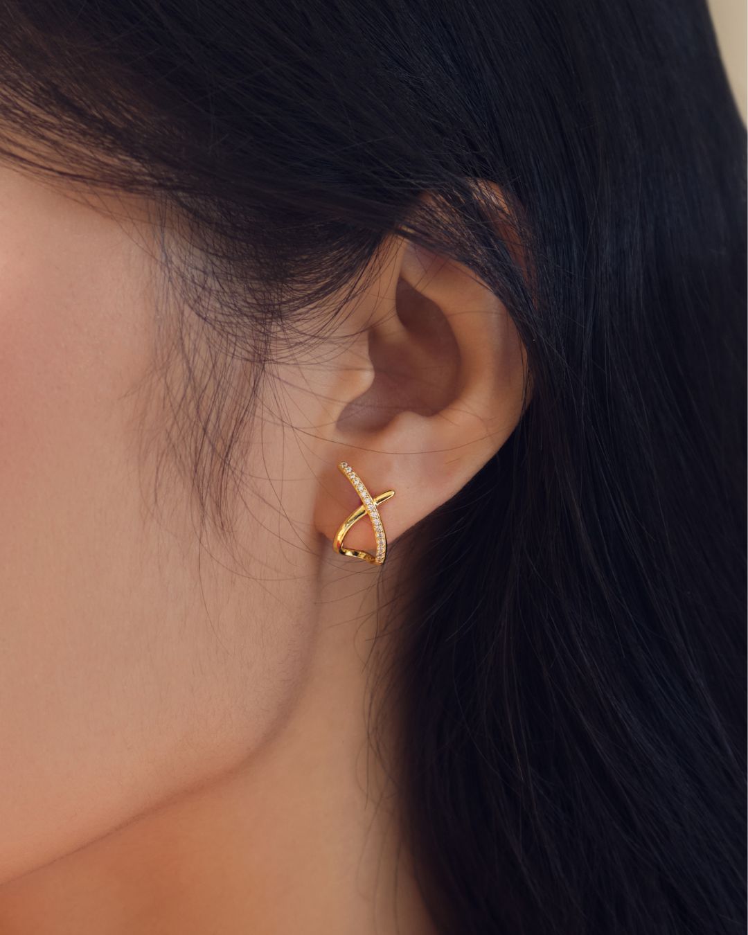 - Design: A modern stud earring in the shape of an 'X', fully paved with sparkling stones.