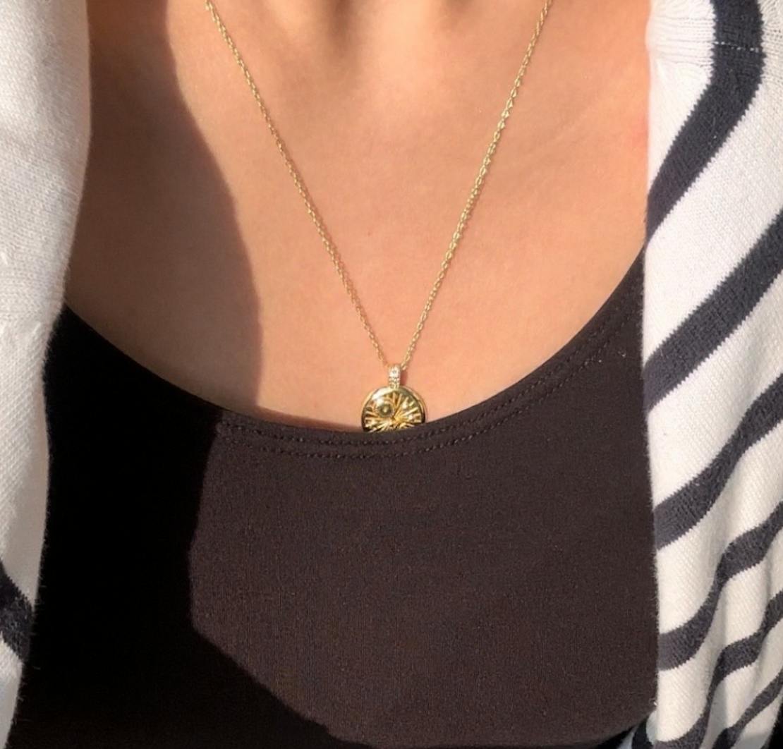 Một lời tôn vinh dành cho sự kỳ diệu của bầu trời đêm. Dây chuyền đầy mê hoặc này nổi bật với mặt charm tròn có hình trăng lưỡi liềm trên nền bụi sao lấp lánh, được treo trên sợi dây xích cable cổ điển. Hãy khắc lên mặt sau để biến lá bùa hộ mệnh vũ trụ này thành bản đồ dẫn đến vũ trụ của riêng bạn.