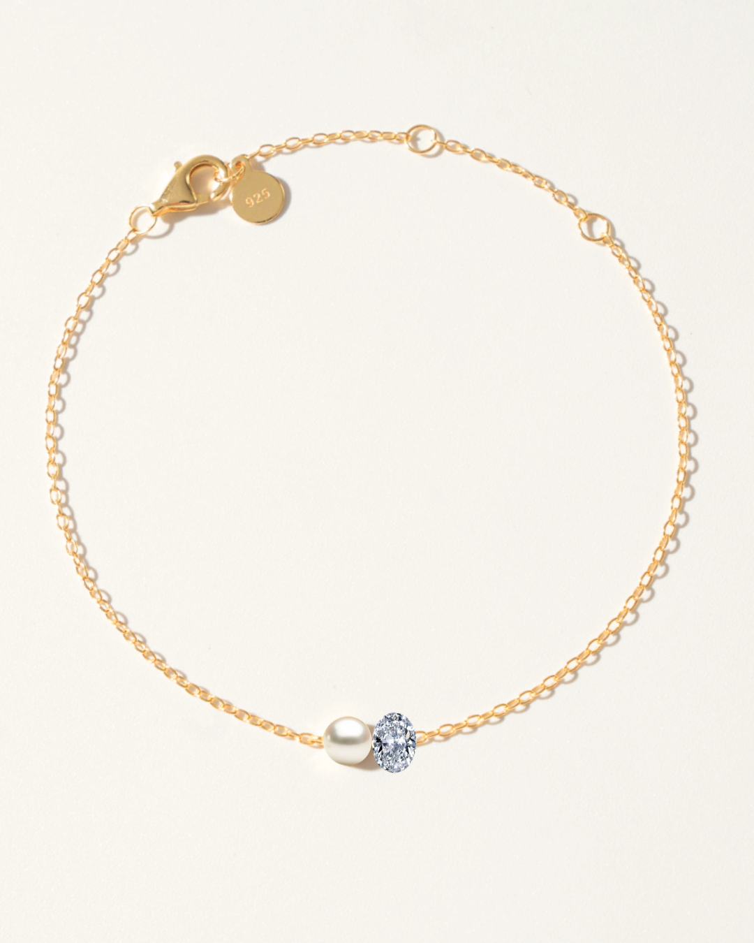- Thiết kế: Vòng tay chuỗi tối giản với sự kết hợp của ngọc trai tổng hợp và đá được gắn trên viền, đặt cạnh nhau.
